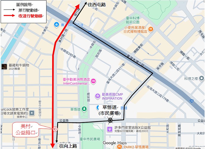 本公司與全航客運、台中客運聯營11路公車,於「2025臺中爵士音樂節」活動期間(114年10月17日起∼114年10月26日止)改道行駛如下圖所示,欲在「草悟道(市民廣場)」站上下車乘客,請至鄰近之「美村公益路口」站上下車,不便之處,敬請見諒。